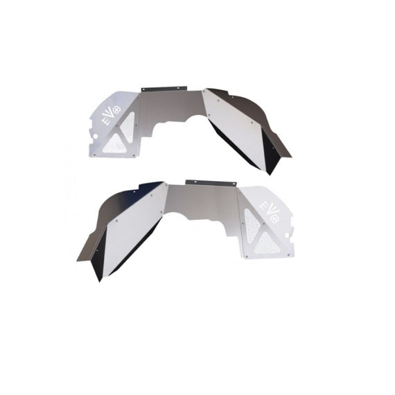 EVO MFG Bolt on Coilover Suspension system front vented inner fender liners clean up the wheel wells while also protecting vital parts in the engine bay from foreign debris. Made in the USA from raw 16 gauge aluminum alloy offers strength, protection and a very low weight. The incorporation of vented backing plates allow heat to escape the engine bay for when you are pushing your Jeep to its limits while also allowing for custom painting options. Using brake formed, precision laser cut panels achieves a premium fitment and appearance for all JL/JLU and JT Gladiator models. Engineered for quick and easy install and complete with all parts necessary for both driver and passenger inner fender liners, you will be back on the trails in no time!