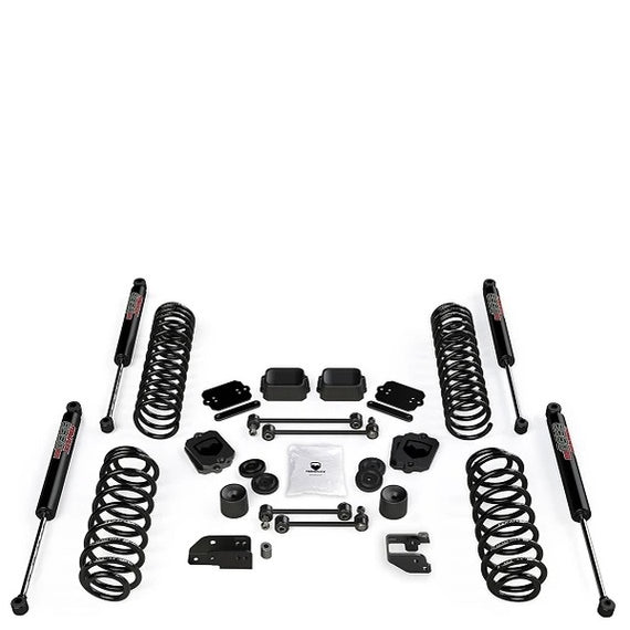The ultra-simple TeraFlex JLU 4dr: 3.5” Coil Spring Base Lift Kit w/ 9550 VSS Twin-Tube Shocks includes just the basic lift components only and doesn’t have the drivability of a full suspension system. Requires front control arm Sport Brackets, or longer front lower control arms, or adjustable control arms, and/or an adjustable front track bar to correct suspension geometry.