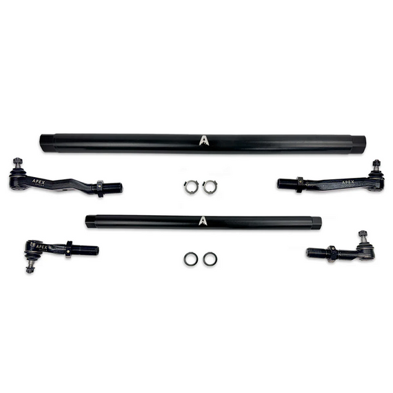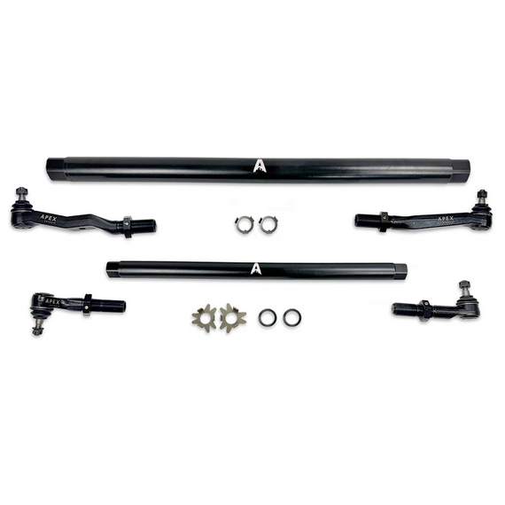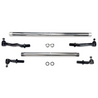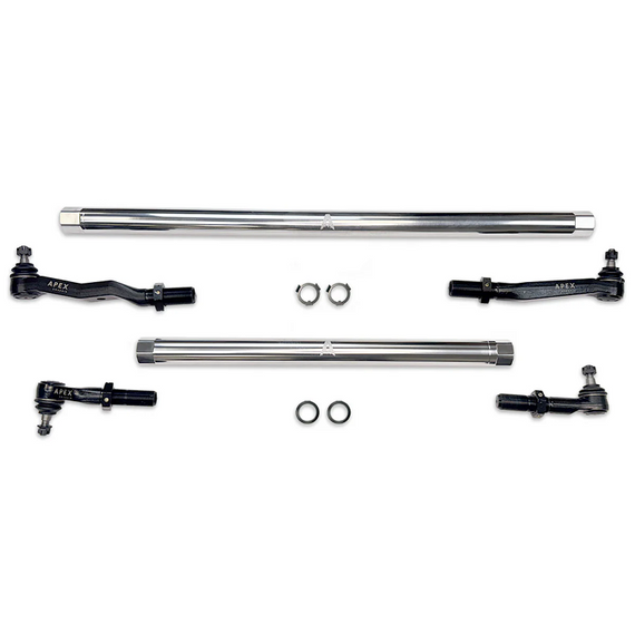A direct replacement extreme duty Tie Rod and Drag Link assembly to replace your underperforming OE steering. Oversized tie rod and drag link ends, connected by massive DOM, Polished Aluminum or Black Aluminum adjusting sleeves, eliminates death wobble and tightens up steering under the most extreme conditions. Weak adjusting sleeves are replaced via tie rod and drag link ends threading directly into the connecting rods and secured by: