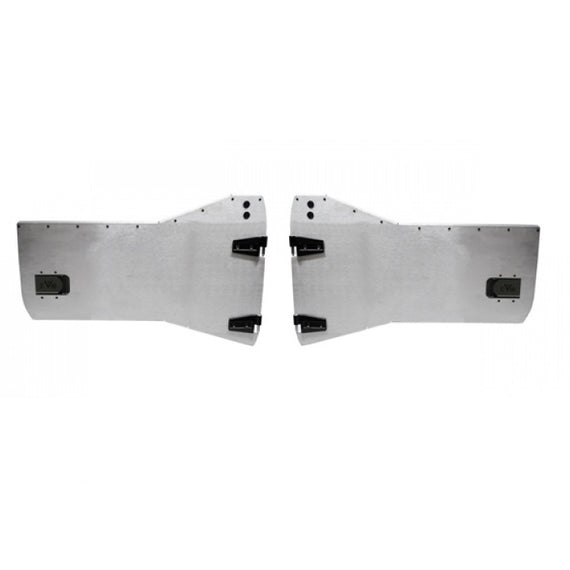 Doors and upper arm rests are made from 3/16” thick aluminum alloy. The EVO MFG manufactured door handle latches are made from Cold Rolled Steel, powdercoated black for corrosion resistance and a clean contrasting appearance. Easy one hand operation handle latches and durable construction. Doors come in raw aluminum finish and can be painted or powdercoated to whichever color you like, if desired.