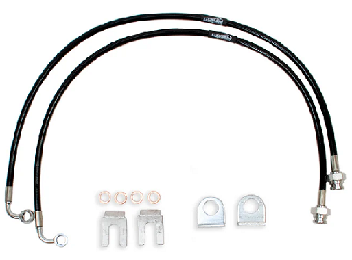 Grimm OffRoad’s stainless steel braided front brake lines can be used for stock or lifted Jeep JK Wranglers and offer improved brake pedal feel by eliminating brake line expansion common with rubber brake lines. These brake lines are DOT compliant and made in the USA. A UV protective PVC cover protects the brake lines from wear. Available in silver or black.