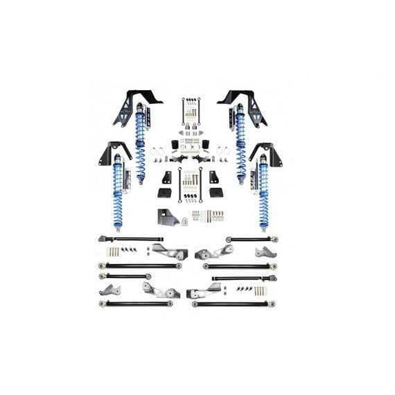 When combining our JLU High Clearance Long Arm kit with the EVO MFG JL Front and Rear NV2514 Coilover kits we create the High Clearance Long Arm PRO. This combination of improved suspension geometry through the EVO MFG JLU High Clearance Long Arm and increased shock travel through our JL Bolt-on NV2514 coilovers, allows you to un-limit the kit and run full shock length yielding 14.5” front wheel travel and 14” rear wheel travel. Suspension cycling the most properly tuned wheel travel is the name of the game.