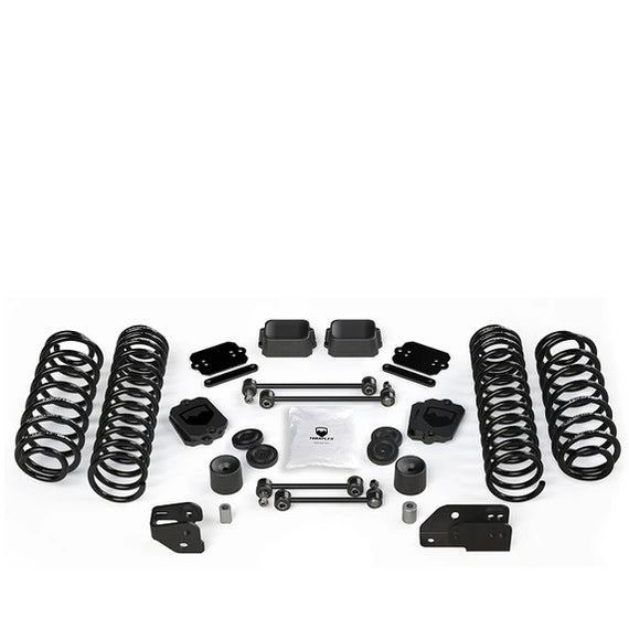 The TeraFlex JLU 4door: 4.5” Coil Spring Base Lift Kit includes just the basic lift components only and doesn’t have the drivability of a full suspension system. Requires front control arm Sport Brackets, or adjustable control arms, and/or adjustable front track bar to correct suspension geometry.