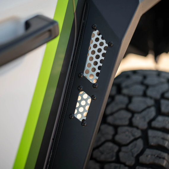 Our Wrangler JL Armor Fender Flares feature a rigid armor-plated design for maximum protection from rocks, shrubs, and other obstacles encountered when on the trail. Their trim fitment offers a sleek styling while also providing a narrow width for navigating tight spaces. The fenders feature aluminum accent panels that can be painted to color match or accent your rig. Included are fully bolt-on paintable fender vent logo plates for added attention to detail. Each of the front fenders include plug-n-play LED button style amber turn signals. The fenders’ rubber seal prevents pebbles, dust, mud, and other debris from getting lodged in between the flares and your Jeep’s body. The fender flares bolt-on using nutserts for an easy install process and sturdy design. They are made from heavy-duty steel, and are finished in a resilient micro-texture black powder coat. With DV8’s Armor Fender Flares, you can navigate tight trails and protect the sides of your Jeep from off-road hazards all while enhancing your Jeep’s rugged exterior.