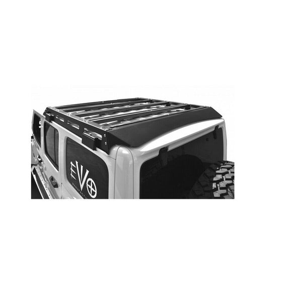The EVO MFG JLU Unlimited Trail Roof Rack is a versatile, no drilling or cutting, easy to install roof rack. Slim low profile design, tight roof connections and sloping faces all contribute to the clean appearance and low wind noise. Simple drip rail mounting allows for installation by even the most novice installer. It requires no drilling or permanent modifications of the hardtop leaving no chance of water damage and see page into the interior compartment. Full length side plates and metal core rubber isolation efficiently distribute all loads and create an isolated quiet and cushioned operation. Flat upper platform gives unlimited options for carrying capacity and 5 T-Slot left to right crossbars offer optimal locating of tie down positions. The EVO MFG JLU Unlimited Trail Roof Rack is Laser Cut and CNC Press Brake formed from steel and powdercoated ("B" kits) black for corrosion resistance. Simple installation with standard tools and supplied hardware. Fits JLU with standard hardtop