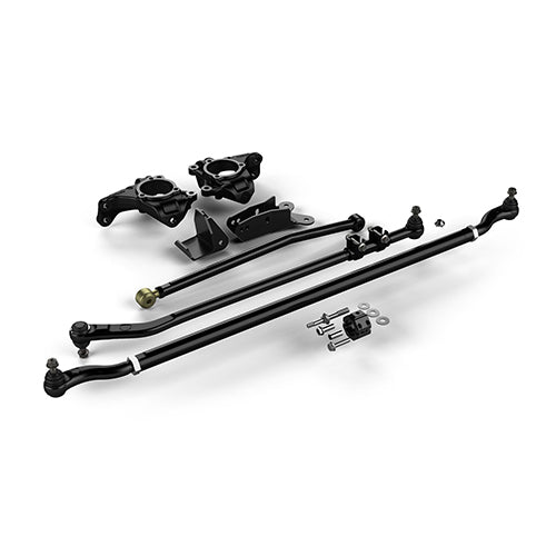 Kit includes: 1 driver high steer knuckle, 1 passenger high steer knuckle, HD tie rod, HD flipped drag link, front trackbar drop bracket, and frame brace kit.