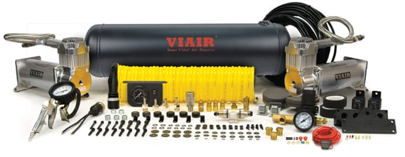 VIAIR’s Dual 450C Onboard Air System is a pre-packaged compressed air solution that provides two 450C, 100% duty cycle compressors, a 2.5 gallon air tank, inline pressure regulation, and all components needed to install a working system capable of inflating tires, managing air locking differentials, and more. For up to 40" tires.