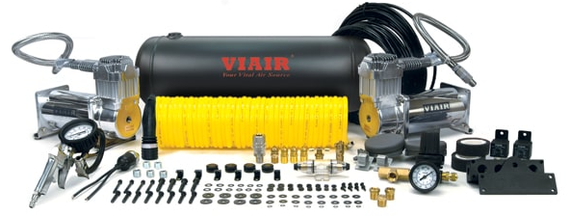 VIAIR’s Dual 400C Onboard Air System is a pre-packaged compressed air solution that provides two 400C, 33% duty cycle compressors, a 2.0 gallon air tank, inline pressure regulation, and all components needed to install a working system capable of inflating tires, managing air locking differentials, and more. For up to 40" tires.