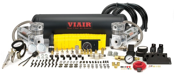 VIAIR’s Dual 380C Onboard Air System is a pre-packaged compressed air solution that provides two 380C, 100% duty cycle compressors, a 2.5 gallon air tank, an inline pressure regulator, and all necessary components needed to install a working system, useful for multiple pneumatic applications.